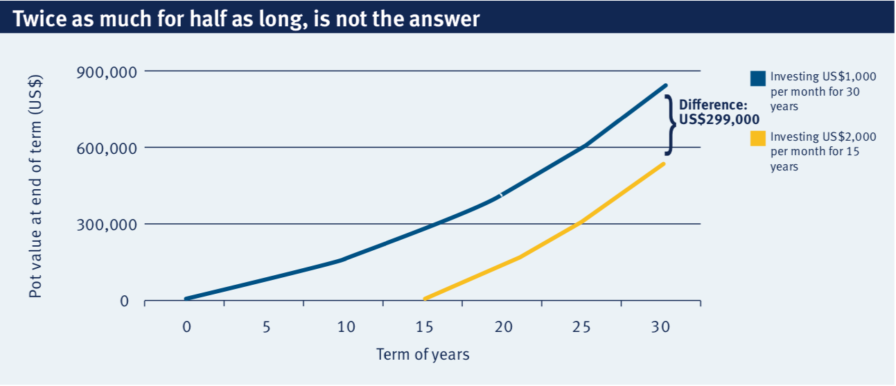 However if you decide to leave it for 15 years and then put in twice as much, so US$2,000 each month, your pot might only be worth around US$536,000* i.e. the end result is almost 1/3 less than if you had started earlier, even though you have put in the same total amount.